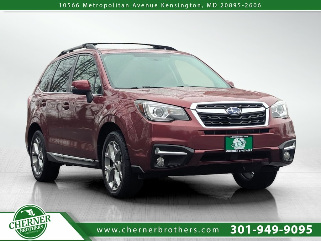 Our great looking Clean CARFAX, One Owner, Maryland State Inspected 2017 Subaru Forester 2.5i Touring CVT AWD in Venetian Red Pearl delivers exceptional versatility, premium comfort, and legendary Subaru all weather confidence. Powered by a responsive 2.5 liter 4 cylinder engine paired with a smooth Continuously Variable Transmission, this Full Time All Wheel Drive SUV offers impressive fuel efficiency along with confident traction and composed handling in changing road conditions. The refined exterior is enhanced by 18 inch alloy wheels, LED auto leveling and steering responsive headlamps, front fog lamps, deep tinted glass, and an express open and close power sunroof. A power liftgate adds everyday convenience, while subtle chrome accents give this Forester Touring a sophisticated and upscale presence. Inside, the Black perforated leather trimmed interior offers premium comfort and thoughtful design. Enjoy heated front bucket seats with 10 way power driver adjustment and memory, a heated leather wrapped steering wheel, and dual zone automatic climate control. The Subaru STARLINK multimedia system with 7 inch display, navigation, Bluetooth connectivity, and harman kardon premium audio system keep you connected and entertained. Smart device integration, push button start, and remote keyless entry further elevate the driving experience. Safety is engineered throughout with Subaru EyeSight driver assist technology, including advanced collision mitigation features, along with blind spot monitoring, rear collision warning, and a rear view camera. Additional protection includes ABS brakes, traction control, electronic stability control, multiple airbags, and a tire pressure monitoring system. Blending capability, advanced safety technology, and premium comfort, this Forester 2.5i Touring AWD is a smart choice for drivers who want confidence in every season without sacrificing refinement. Save this page and call for availability. We know you will enjoy your test driv
