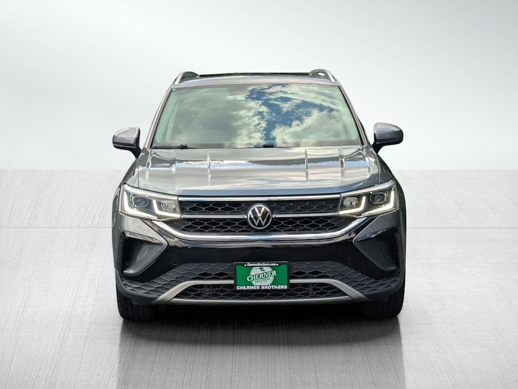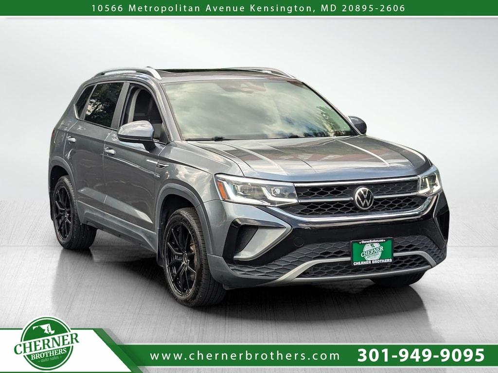 Our great looking Maryland State Inspected 2022 Volkswagen Taos 1.5T SEL is stylish, capable, and fun to drive in Platinum Gray Metallic! Powered by a TurboCharged 1.5 Liter 4 Cylinder that delivers 158hp paired with a smooth-shifting 8 Speed Automatic transmission for lively performance and excellent efficiency. This Front Wheel Drive SUV is agile and confident on the road, returning nearly 36mpg on the highway while showing off a modern design with LED headlights, bold aluminum wheels, a panoramic sunroof, and sleek, aerodynamic lines that turn heads everywhere you go. Inside our Taos SEL, you will find an upscale cabin that blends comfort with advanced technology. Settle into leather seats with heated and ventilated front cushions, enjoy dual-zone automatic climate control, and adjust your 8-way power driver seat to find your perfect position. The Volkswagen Digital Cockpit Pro keeps all your driving info right in front of you, while the 8-inch touchscreen infotainment system with navigation, Bluetooth, wireless Apple CarPlay/Android Auto, satellite radio, and a premium BeatsAudio sound system keeps you connected and entertained mile after mile. Volkswagen takes your safety seriously, equipping this Taos with adaptive cruise control, blind-spot monitoring, lane-keeping assist, forward collision warning with automatic emergency braking, stability/traction control, ABS, and a full array of advanced airbags. The 2022 Taos SEL is ready to handle your daily drives and weekend getaways with style, efficiency, and peace of mind! Save this Page and Call for Availability. We Know You Will Enjoy Your Test Drive Towards Ownership!